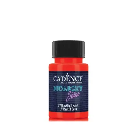 Midnight Shine UV Reaktif Boya, UV mavi ışık altında ortaya çıkan akrilik boyadır. Boya uygulandıktan sonra beyaz görünür, kuruduğunda şeffaflaşır ve UV mavi ışığı altında renkli olarak floresan olur. Yıkamadan önce arkadan ütü ile sabitlenmelidir. Kağıt, karton, ahşap, mat boya, kumaş, spor ayakkabı, deri ve bir çok yüzey dahil kullanıma uygundur. Cam, metal ve bazı plastik yüzeyler için önce genel amaçlı astar kullanımı gerekebilir. Boya, kumaşta açık tonlarının yanı sıra koyu kumaşta da örtücüdür. Kuruma sonrası ütüyle sabitlenip 30°C’de yıkanabilir. Sağlığa zararlı madde içermez. CE & EN71 normlarına uygundur.